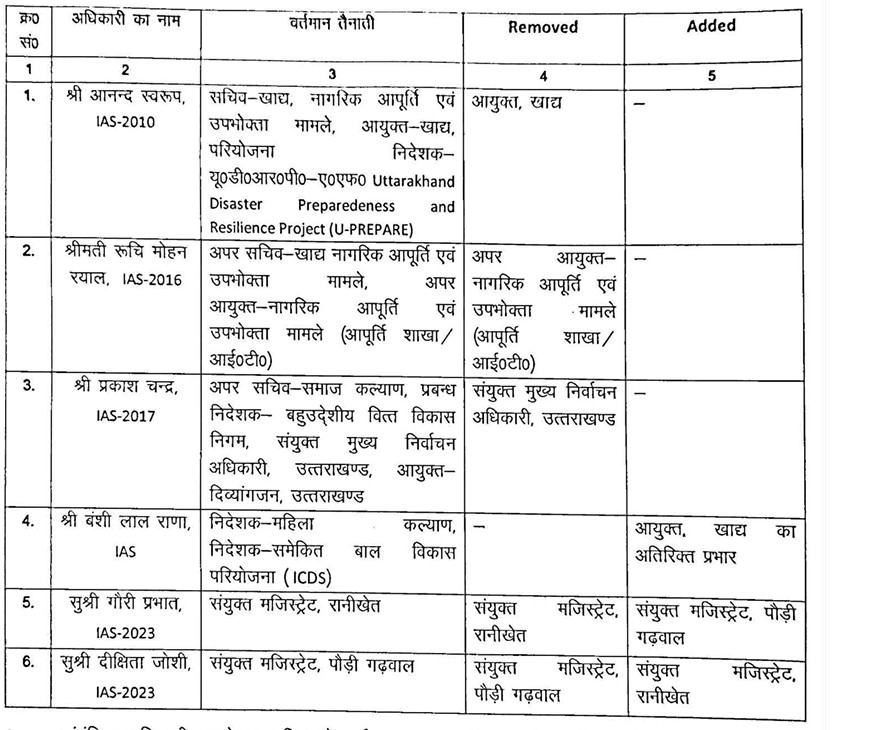 आईएएस 2010 बैच के अधिकारी आनंद श्रीवास्तव को सचिव-खाद्य, नागरिक आपूर्ति एवं उपभोक्ता मामले सहित अन्य दायित्वों के साथ कार्यरत रखते हुए आयुक्त खाद्य का प्रभार हटाया है। वहीं आईएएस 2016 बैच की ऋचा मोहन रयाल से अपर आयुक्त-खाद्य, नागरिक आपूर्ति एवं उपभोक्ता मामले (आपूर्ति शाखा/आईटी सेल) के प्रभार से मुक्त किया गया है।