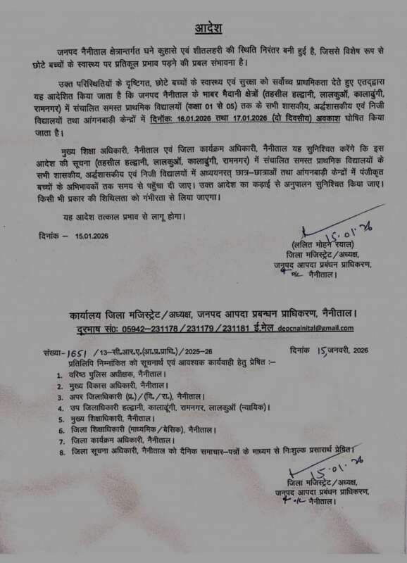 इस निर्णय के तहत तहसील हल्द्वानी, लालकुआ, कालाढुंगी और रामनगर क्षेत्र में संचालित कक्षा 1 से 5 तक के सभी सरकारी, अर्द्धशासकीय और निजी प्राथमिक विद्यालयों के साथ-साथ आंगनबाड़ी केंद्रों में 16 और 17 जनवरी 2026 को अवकाश रहेगा।