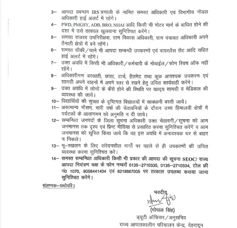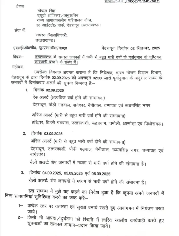 Uttarakhand: Weather Update: उत्तराखंड मौसम विभाग ने बुधवार, 03 सितम्बर 2025 के लिए भारी बारिश का पूर्वानुमान जारी किया है। देहरादून, उत्तरकाशी, पौड़ी गढ़वाल, नैनीताल, ऊधमसिंह नगर, चम्पावत और बागेश्वर जिलों में ऑरेंज अलर्ट घोषित किया गया है। इन जिलों में भारी से बहुत भारी वर्षा होने की संभावना है, जिससे भूस्खलन, सड़क अवरोध और नदियों-नालों का जलस्तर बढ़ने का खतरा बना रहेगा। वहीं प्रदेश के अन्य जिलों के लिए येलो अलर्ट जारी किया गया है, जहां मध्यम से भारी वर्षा हो सकती है। मौसम विभाग ने लोगों से अनावश्यक यात्रा से बचने और सुरक्षित स्थानों पर रहने की सलाह दी है। संवेदनशील क्षेत्रों में रहने वाले लोगों को सतर्क रहने और प्रशासन के निर्देशों का पालन करने की अपील की गई है। आपदा प्रबंधन विभाग ने भी जिला प्रशासन को पूरी तरह अलर्ट मोड पर रहने और आपात स्थितियों से निपटने के लिए तैयार रहने के निर्देश दिए हैं।