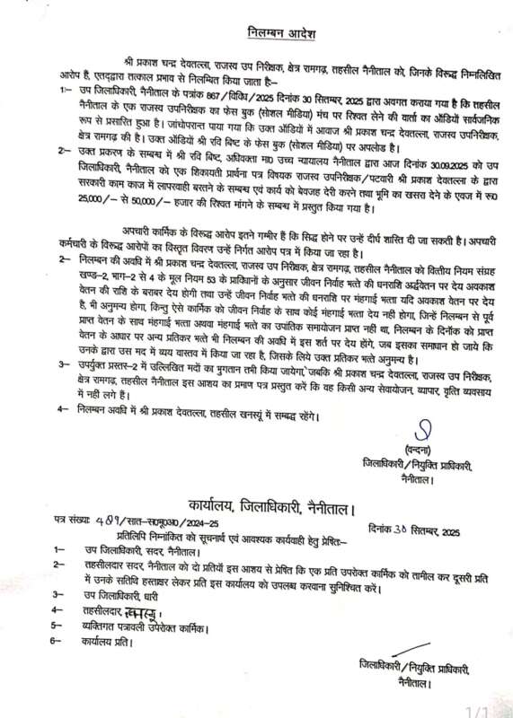इस संबंध में जिलाधिकारी नैनीताल ने उन्हें निलंबित कर तहसील खनस्यूं में सम्बद्ध किया है। साथ ही, विभागीय जांच के आदेश भी जारी किए गए हैं। जिलाधिकारी ने स्पष्ट किया है कि यदि जांच में दोष सिद्ध होता है…तो आरोपी पटवारी के खिलाफ सख्त विभागीय व कानूनी कार्रवाई की जाएगी।