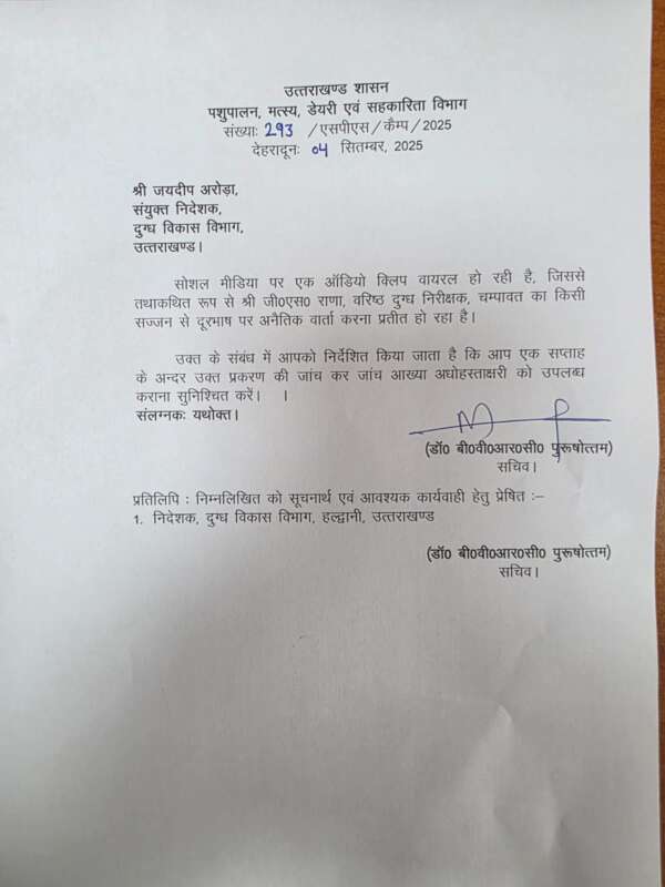 इस मामले पर विभागीय सचिव डॉ. बी.वी.आर.सी. पुरुषोत्तम ने संज्ञान लिया है और संयुक्त निदेशक, दुग्ध विकास विभाग, उत्तराखंड को जांच के निर्देश दिए हैं। आदेश में कहा गया है कि पूरे प्रकरण की तथ्यात्मक जांच की जाए और जांच आख्या शीघ्र उपलब्ध कराई जाए।
