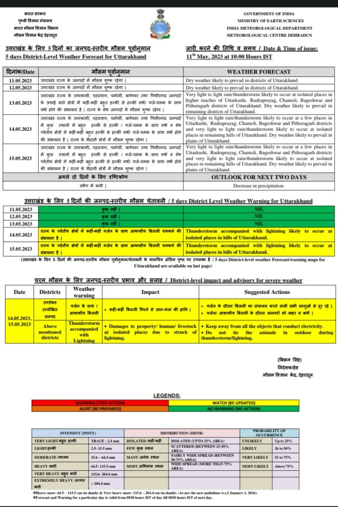 देहरादून: मौसम विज्ञान केंद्र द्वारा अपेडट जारी किया गया है। मौसम विभाग के अपडेट के अनुसार 12 मई तक उत्तराखंड में मौसम शुष्क रहेगा। लेकिन 13 मई से मौसम बदलेगा। उत्तरकाशी, रुद्रप्रयाग, चमोली, बागेश्वर और पिथौरागढ़ के ऊंचाई वाले क्षेत्रों में हल्की बारिश होने के आसार है। वहीं 14 और 15 मई के लिए मौसम विभाग ने येलो अलर्ट जारी किया है। राज्य के पर्वतीय जिलो में गर्जन के साथ आकाशीय बिजली गिरनी संभावनाएं हैं। वहीं पहाड़ी जिलो में बारिश भी हो सकती है लेकिन मैदानी क्षेत्रों में मौसम शुष्क ही रहने वाला है।